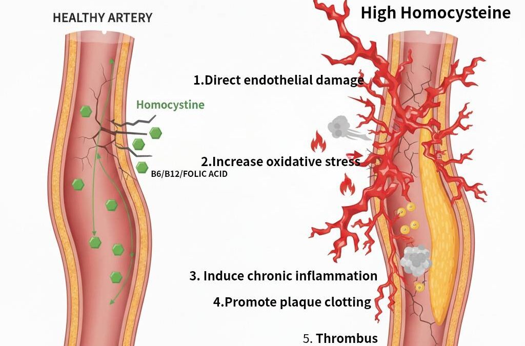 Homocysteine facilitates the oxidation of “bad cholesterol” (LDL). Oxidized LDL is more toxic and more easily infiltrates the damaged vessel walls, accumulating to form plaques. It acts as an “accomplice” to bad cholesterol, accelerating the process of vessel blockage.